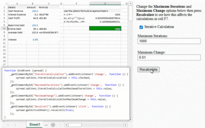 Incremental calculations allow users to reuse previous results and refine outcomes through repeated recalculations. To enable this functionality in SpreadJS, set the iterativeCalculation property to true, allowing adjustments to continue until a specific target is met—ideal for complex financial models and forecasting scenarios. You can also perform what-if analysis with the CalcEngine.goalSeek function, which uses iterative calculations in SpreadJS to determine the necessary input for achieving desired results.