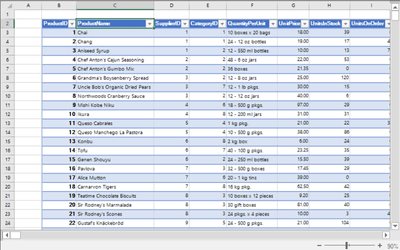 Spread supports creating a table from a range of cells to make managing and analyzing a group of related data easier. Tables include banded rows, columns with data, a header row, a total row, and a sizing handle. The data in the table can be managed independently from data in other rows or columns on a sheet. Tables in spread also support filters, resizing, and sorting. You can also apply styles to a table or bind it to data. Formulas can also be added to the table, and cells within the table can be used in other formulas using structured references.