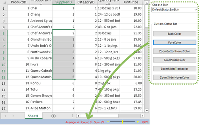 You can add a status bar to the component. This bar allows you to set zoom settings and displays information such as the average, sum, and counts for selected cells. These options can be enabled or disabled by right-clicking on the status bar. The visibility of the status bar itself can also be changed using the StatusBarVisible property. This can also be done from the Spread Designer in the properties window. The colors of the status bar can also be customized, specifically the background, zoom slider, foreground, zoom button, and the hover states for each.