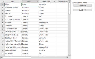 Sorting in Spread can be done in various ways, one of which is automatic sorting. This can be accomplished by letting the user automatically sort rows by clicking on a column header. Rows and columns can also be automatically sorted via code. In addition to sorting rows and columns, ranges of cells can also be sorted. Textual information can be sorted in alphabetical order, numbers in ascending/descending order, dates from newest to oldest and vice versa, and data based on the colors and icons in a cell range. Sort indicators can also be customized by setting custom images, hiding them, or selecting specific rows to show sort indicators.