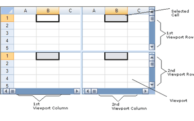 Spread supports customizing viewports by dividing up the display into separately scrollable viewports. This supports a set of horizontal, vertical, or both viewports. This allows you to display different parts of a very large spreadsheet in a very limited viewing area, letting you add, remove, and customize viewports programmatically. End users can also create and use viewports. This also supports frozen rows and columns, where they are treated as a separate viewport.