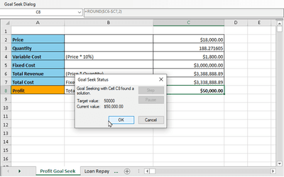 The Goal Seek functionality is supported in Spread. This can be accomplished using the GoalSeek method, which is used to find a value that will produce the desired result for a formula. This allows you to perform what-if analysis in worksheet, in which altering the cell values affects the outcome of worksheet formulas. In addition to the method, Spread provides a dialog for Goal Seek in the Spread Designer. This can also be invoked at runtime using the GoalSeek method of the BuiltInDialogs class.
